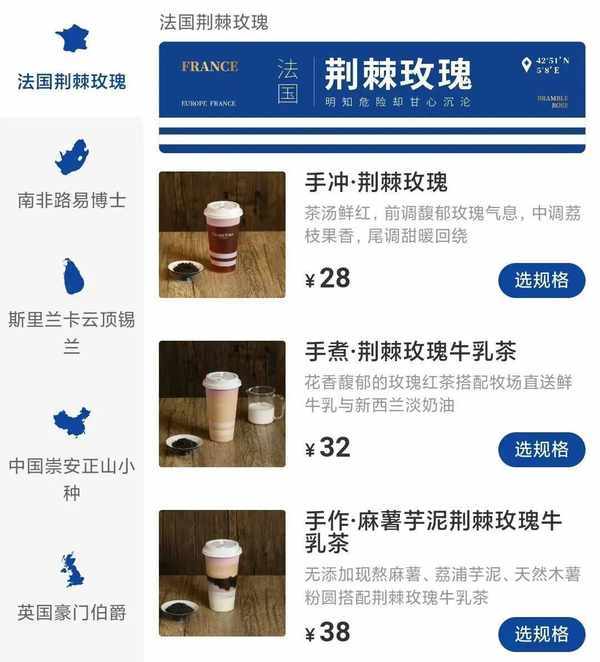 他们也在产品中凸显“世界茶”的概念,全球范围内寻找红茶,比如中国正山小种、南非路易博士、斯里兰卡云顶锡兰等等,门店菜单还用一份全球地图展示。