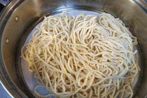 3、接下来处理面条,蒸锅中坐水,蒸锅上汽以后把准备好的湿面条整齐的放入蒸锅中,大火蒸10分钟左右。