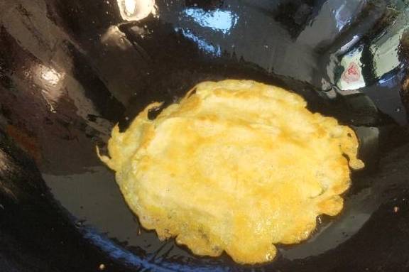 4、蒸面条的时候,我们可以来煎一个鸡蛋饼,锅里加入适量食用油,油温升高后倒入鸡蛋液,把蛋液煎至定型后翻面,煎至两面金黄后盛出备用。