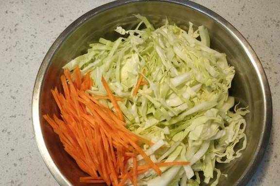 1、把包菜洗净切成细丝,胡萝卜洗净去皮切成细丝,大葱切成葱花、大蒜拍碎剁成蒜末备用。