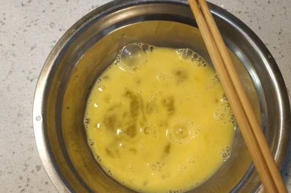 2、鸡蛋两颗打入碗中,加入半小勺盐,用筷子炒一个方向搅拌均匀,充分打散备用。