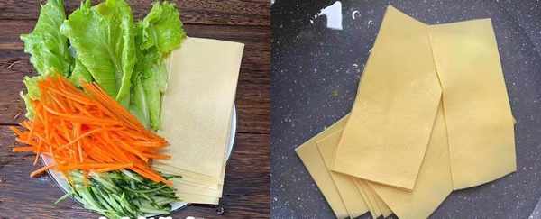 2、然后将生菜和胡萝卜丝,都卷在豆皮中,这道豆皮卷就完成了。