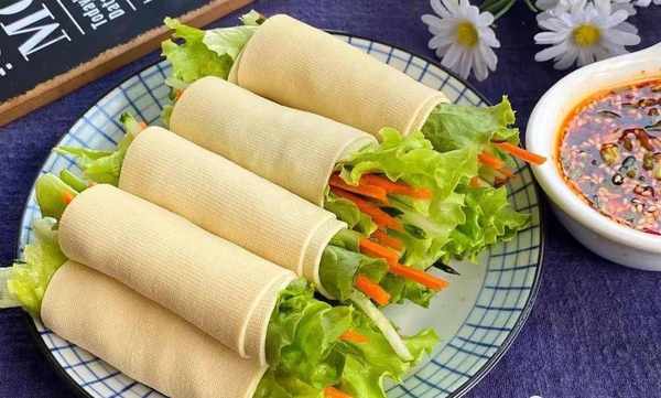 4、做好的豆皮卷,沾着酱料一起吃,清爽不油腻,味道绝了。