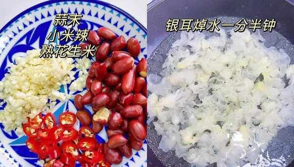 2、另外准备蒜末、花生米、小米椒辅料。然后烧开热水,倒入银耳,焯水1分半捞起。