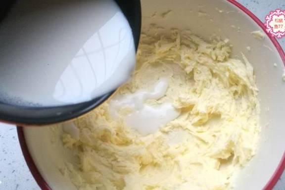 4、牛奶分成4—5次加入到黄油中,每加入一次打发均匀后再加入下一次,防止黄油出现水油分离。牛奶可以用微波炉加热30秒,感觉一下温度,稍微有点温不凉就可以。