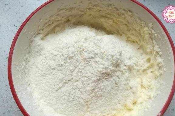 6、把低筋面粉和奶粉一起过筛到打发好的黄油里面。面粉过筛的目的一个是让曲奇饼干更疏松,二是为了防止面粉结块,过滤掉面粉中的杂质。