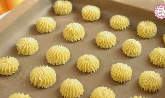9、烤盘铺上烘焙纸,把曲奇面糊垂直挤在烤盘上,中间要有间隔,因为烤好后曲奇饼干会膨大。挤曲奇的时候就可以去预热烤箱了,上火200度下火190度预热10分钟。面糊挤完了,烤箱也就预热好了,把曲奇送进烤箱,已预热的温度烘烤8分钟定型后,转成上火185度下火175度烘烤10分钟就好了。