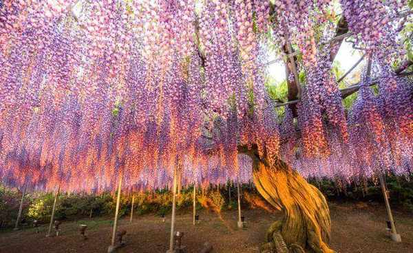 栃木县足利花卉公园的紫藤花观赏时间为3月18日至3月20日。在这个为期一个月的活动中,游客将看到150年前的各种紫藤树。晚上会有灯光来营造气氛。靠近东京,是一个享受春天悠闲夜晚的好地方。