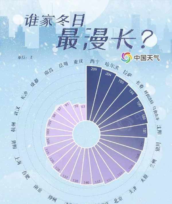 然而,即使在寒冷的哈尔滨,冬季的持续时间也只有205天,比西宁还短。4天。西宁无严冬