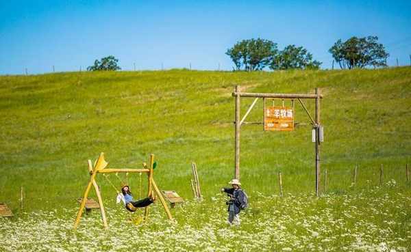 秋千在花海中摇曳,绿草白花构成了拍照打卡最美的地方。