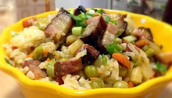 3 正常进行淘米,焖饭的水较正常焖饭少一点。将炒好的土豆腊头红肠倒入焖饭煲中。