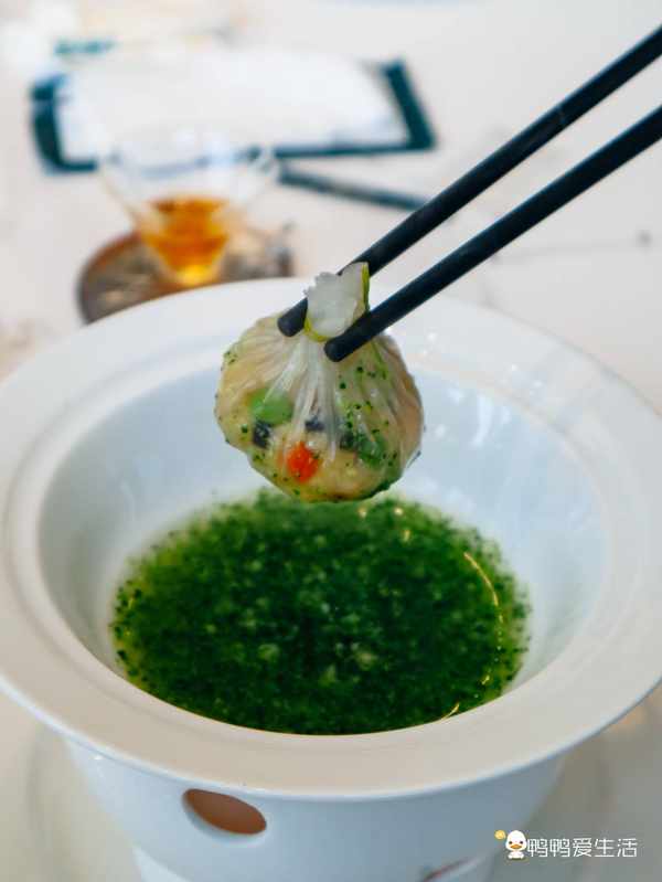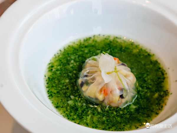 山海兜,兜子,一种曾经在两宋京城叱咤风云过的小吃,也有圆满之意。这里用的是绿豆水晶白玉皮,包入干贝、虾仁、笋芽、青豆、蕨菜等,口感细腻润滑,富有鲜味,层层递进,富有浓郁的春鲜之味。