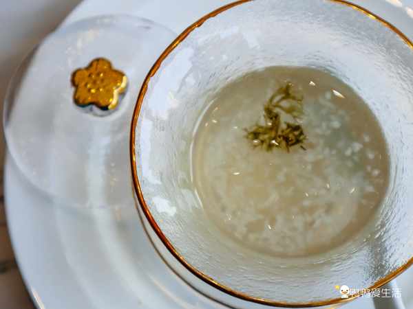 沆瀣浆,原为《山家清供》中的解酒汤,私厦里经过升级,做成甜汤水。用的是漳州甘蔗和本地萝卜煮出的甜汤水,加入漳州石花刨成丝状,点缀脆爽竹燕窝,做餐后甜品恰到好处,一口冰甜。
