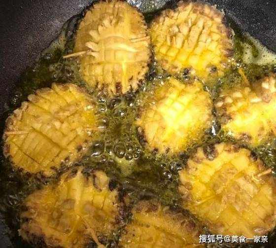 锅里加入适量的植物油,油热以后,将刚才准备好的香菇一一下入油中,炸至金黄色捞出来控油;