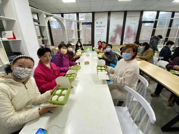 平日在活动中辛苦服务的志愿者们终于能够忙里偷闲、享受欢乐,与社区居民们相互讨论,遇到问题举手请教,活动现场充满了欢声笑语。软糯柔滑的面皮、清甜的草莓馅和奥利奥碎馅,面皮对角捏紧粘合,扭转几下,一个可爱的雪媚娘便出现了。看着一个个细白软糯的雪媚娘跃然眼前,所有人的热情一下子被调动起来。