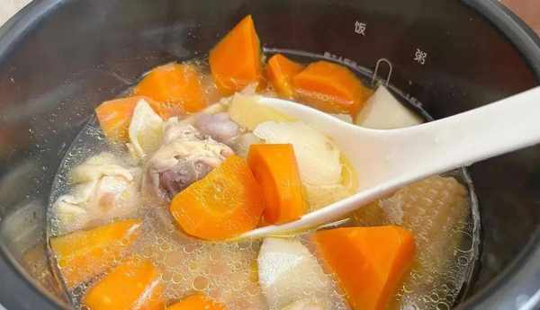 3、将鸡肉、胡萝卜、山药、玉米一起倒入锅中,加足量清水,大火煮开后,转小火炖1个小时,再放点食盐进去调味,即可出炉。