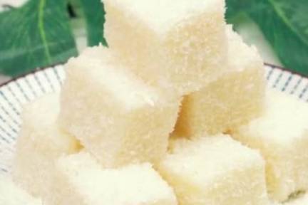 把椰蓉装进盘里,再把切好的豆奶糕放进。让豆奶糕都裹上椰蓉.