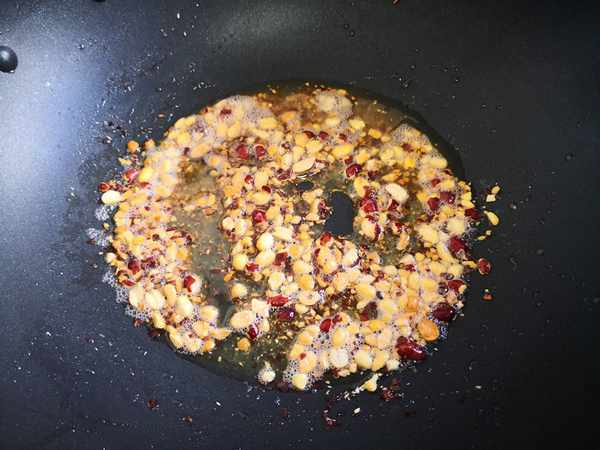 3.取一把花生米用蒜臼子捣成花生碎,然后起锅加油,放入花生碎不停地翻炒,炒香后盛入盘中晾凉备用。