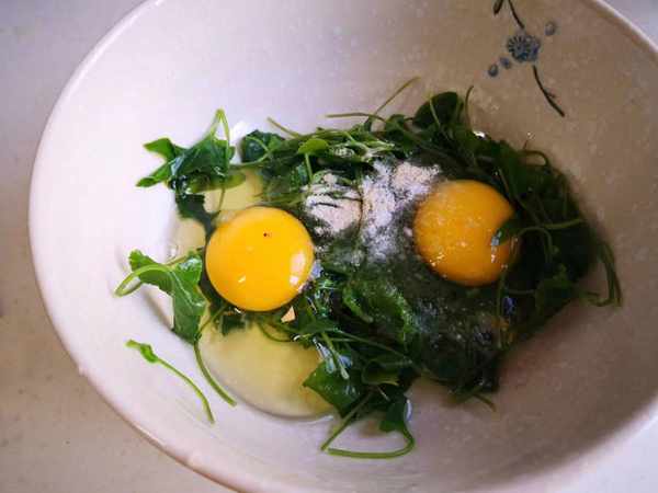 1.焯水后的紫花地丁沥干水分放入大碗中,然后打入2个鸡蛋,加入适量的盐和胡椒粉,充分搅拌均匀后备用。