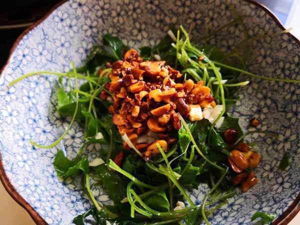 4.再取2瓣大蒜剁细后放入焯过水的紫花地丁中,接着倒入炒香的花生碎,再加入盐、味极鲜、少许香油和米醋搅拌均匀即可,老香了!