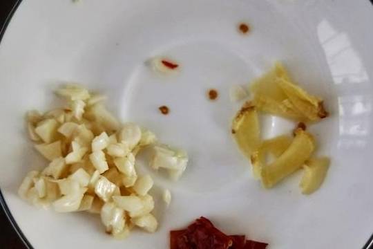 3.大蒜、生姜切小块,干辣椒也切成小段