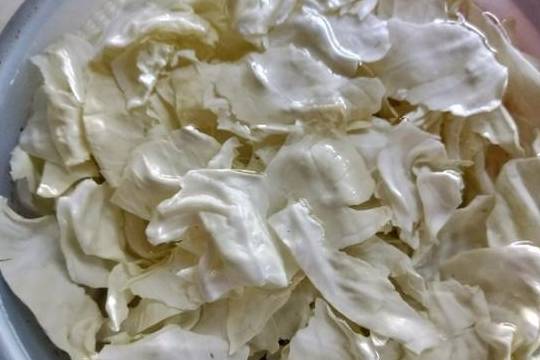 1.包菜去掉老叶和梗,剥成一片一片后,手撕成小块,用清水漂洗干净,沥干水分备用