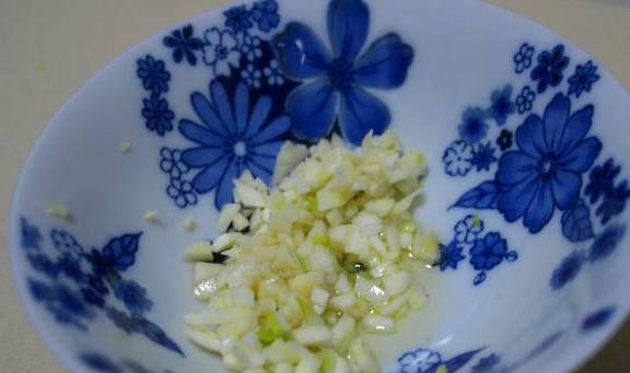 2、大蒜切成末,锅中放入少许油烧热,浇在大蒜上,然后加入生抽和少许白糖,拌匀。