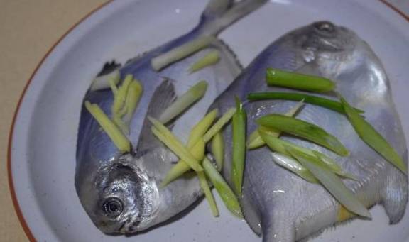 1、银鲳鱼洗净,去掉内脏,在鱼身上斜切两三个口子,用料酒涂抹鱼的全身,放上姜丝和葱段,腌制半小时左右备用。