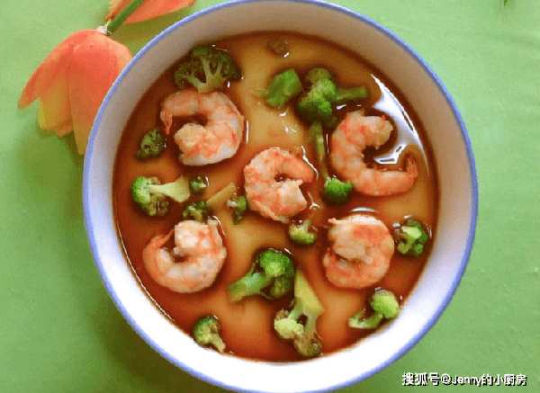 等鸡蛋蒸八分钟后,将西蓝花、虾仁放进去,淋一点生抽、香油,再继续蒸三分钟,这道早餐就搞定了。