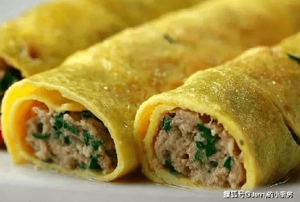 煎好后放在案板上,再铺满肉馅。处理好了卷起来,越紧越好。