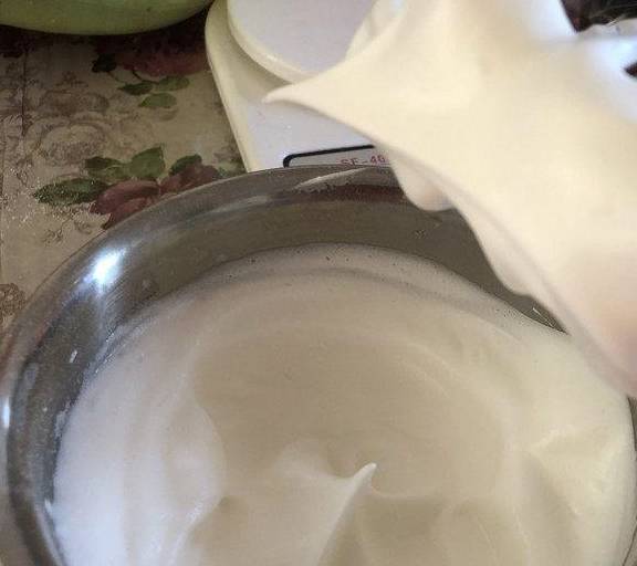 蛋白中,分三次加入30g加糖,用打蛋器打发。打发至如图,提起打蛋器有尖角。