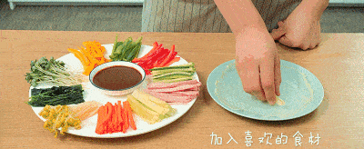 食 材 豆芽,蔬菜丝(甜椒丝、黄瓜丝、菠菜、胡萝卜丝等),火腿,饺子皮,甜面酱,食用油;