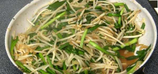 3、接着热锅炒豆芽和韭菜,加少许盐炒至蔬菜变软出水。