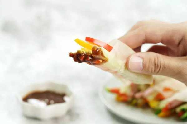 5、然后蘸点甜面酱就可以开吃啦,一口一个,新鲜爽脆,保准你会爱上!