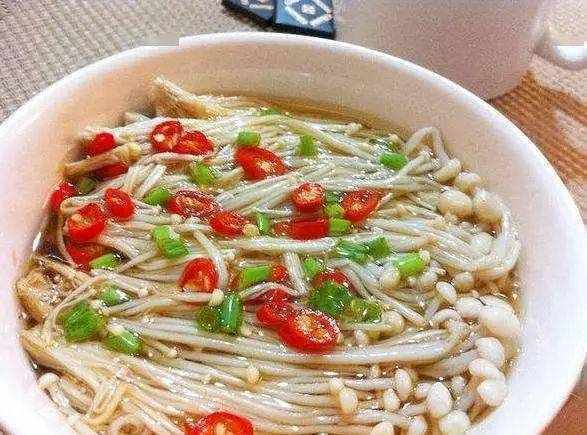 1、金针菇挑去金针菇老的部分;将金针菇浸泡在淡盐水里,之后将金针菇放入锅里焯熟,过一下凉白开,沥干水分备用。