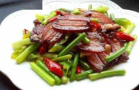原料:蒜苔,腊肉,红辣椒,酒半小匙,胡椒粉少许,盐少许,糖少许