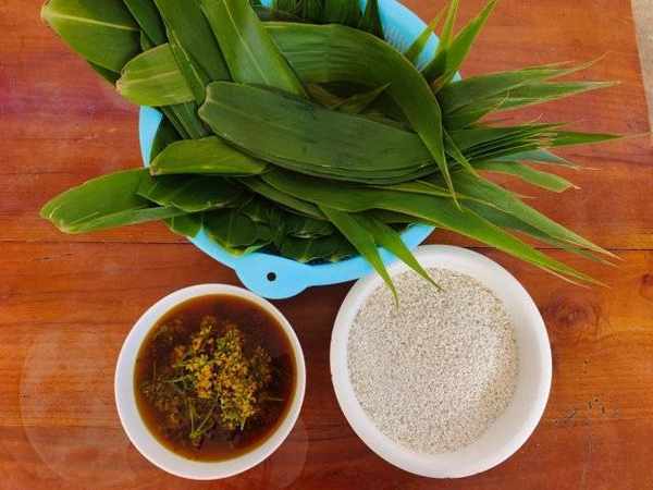 取春发之粽叶,旋转打个窝包成滇西特有的三角尖粽再放入锅里煮熟,一锅深受当地人民喜爱的染饭花糯米粽就做好了。