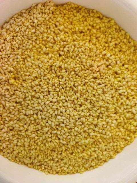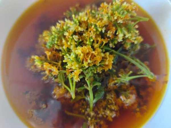 搜集好染饭花后,先用高温水煮,最大程度地释放染饭花中的黄色素,煮好后过滤,待水放凉后放入糯米浸泡上色。