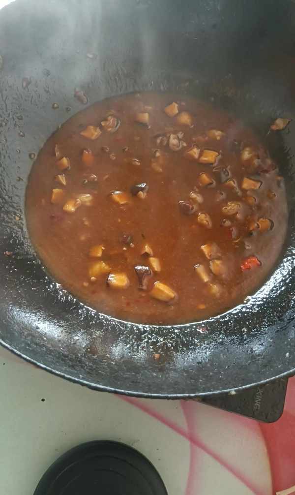 4,锅中倒入食用油,油热放入肥肉丁,炒出多余油脂后,下入干尖椒丁,葱姜末,炒出香味后放入香菇丁,二十秒后放入一勺香辣酱炒出红油,加入少许生抽,少许老抽,适量盐,一小勺白糖,一小勺醋,一勺料酒,少许味精,大火烧开后把蒸鱼后盆中的汤汁也加进来,开后用水淀粉勾芡,待汤汁浓稠时淋入一勺食用油,使欠汁亮泽。