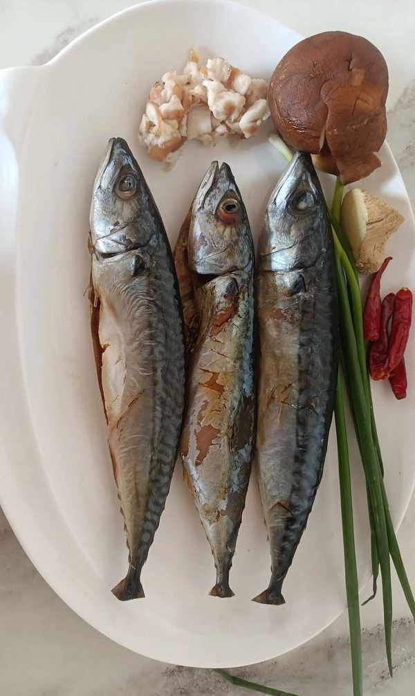 菜谱的名字叫《鱼香鲅鱼》,食材有:鲅鱼三条,香菇两个,小葱,姜少许,肥五花肉一两,干尖椒五个。