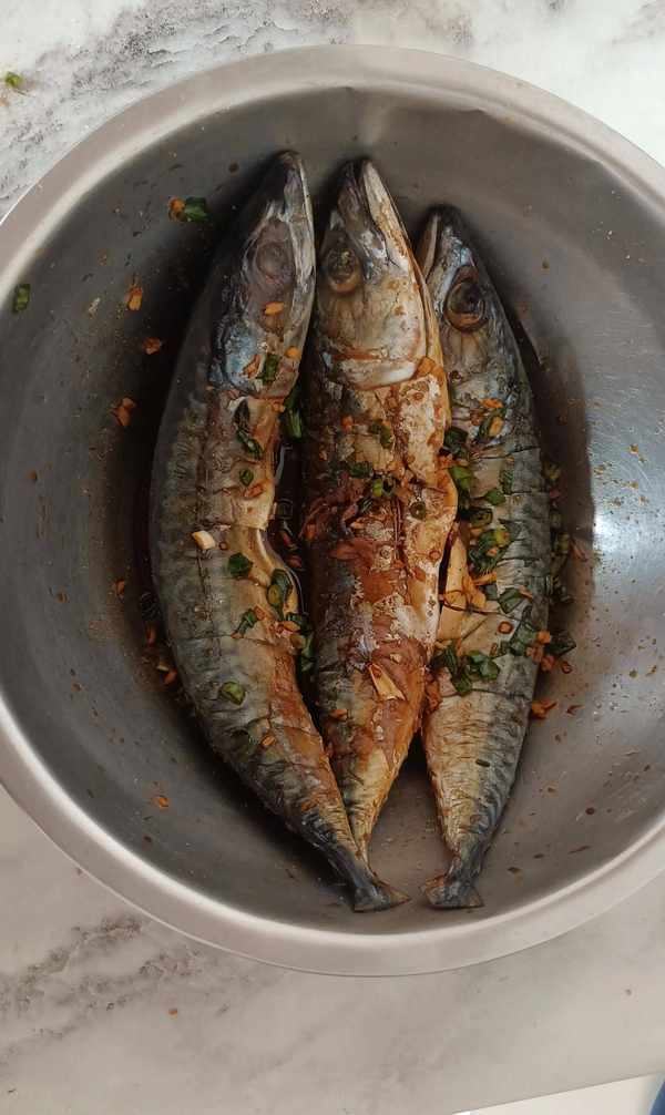 2,在每条鲅鱼上打上一字花刀,便于腌至入味,然后放入一勺盐,一勺料酒,一勺胡椒粉,一勺生抽,少许老抽,一把葱姜末。用手在每个鲅鱼身上搓均匀,使淹鱼的料汁充分与鱼融合,放一旁淹至一多小时。