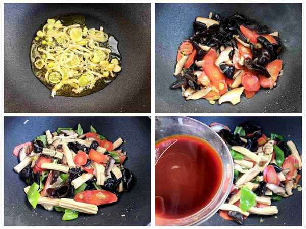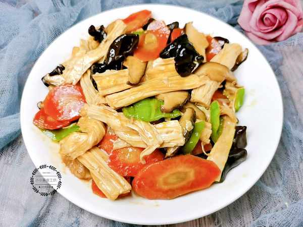 3、热油爆香葱花,加入胡萝卜和香菇翻炒变软,再加入木耳和腐竹继续翻炒。最后淋入调好的酱汁,大火翻炒均匀即可出锅。