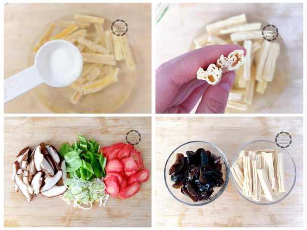 1、将腐竹通过加入食盐和白醋的方法泡发,然后洗净备用。同时再泡发一些木耳备用,准备适量香菇,胡萝卜,青椒和大葱,洗净后切片。