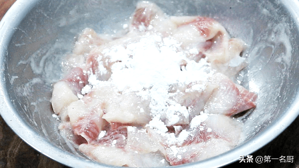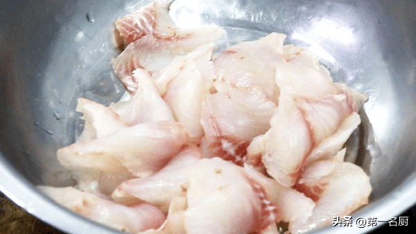 1.准备二斤处理好的黑鱼一条,中间切开,片开鱼肉,先斩掉鱼头和鱼骨,去掉鱼刺和鱼皮,把鱼肉切成薄片,放入盆中。加入适量的清水,用手抓洗两遍,洗去鱼肉里的血水,挤干水分放入盆中。