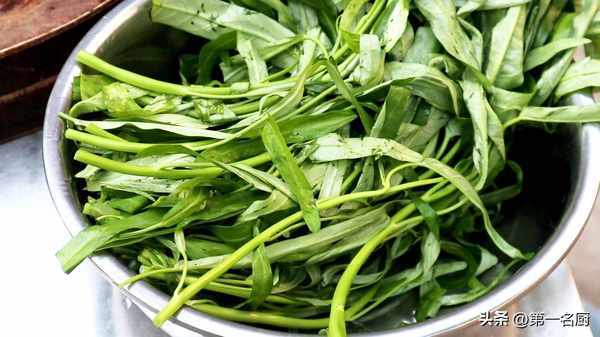 1.准备一把空心菜,洗净后去掉根部,把茎和叶分开来放。