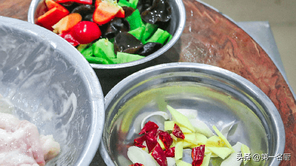 3.青椒半个切成三角块,提前泡好的木耳一小把,红椒半片切成三角块用来配色,大葱半根切成马蹄片,生姜一块切成菱形片,再放入几粒红干椒备用。