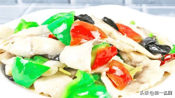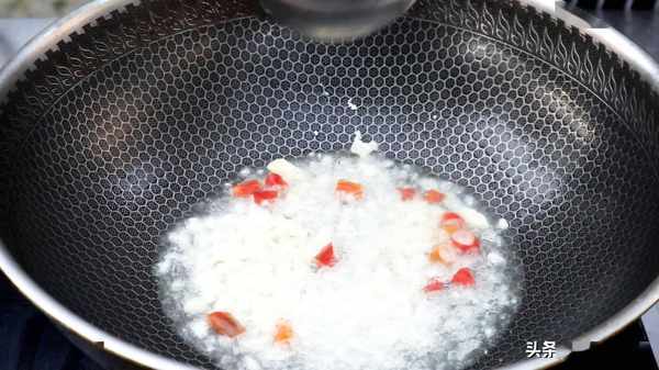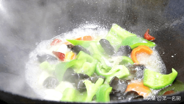 5.另起锅添油,倒入葱姜和红干椒爆香,再倒入青红椒片,翻炒几下,淋入少许清水,加入料酒,白醋各适量,加入食盐2克,鸡粉1克,再加入少许水淀粉,使汤汁浓郁粘稠。