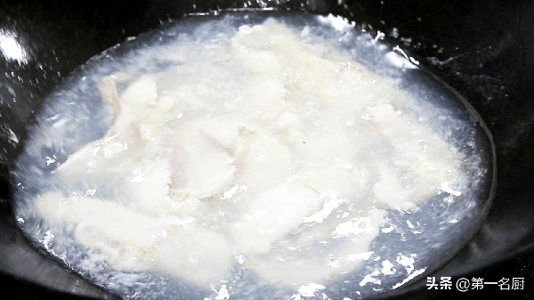 4.起锅添入适量清水,加入少许植物油,水开后离火,下入腌好的鱼片,下完以后,上火继续煮20秒,用勺子轻轻推动几下,倒入漏勺中控水备用。