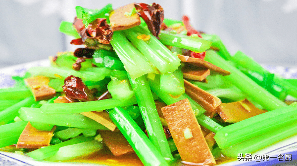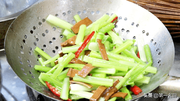 2.起锅烧水,加入一勺食盐,再加入少许植物油,等水烧开后,下入芹菜,小米椒和香干,用勺子翻动几下,焯水一分钟,倒入漏勺中控水,再过凉水备用。