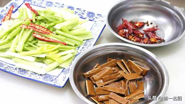 1.洗净的芹菜一把,把芹菜切成长段,小米辣3个从中间切开,豆腐香干100克,切成长条,生姜一小块,切成姜末,放入盆中,取一个小盆,放入几粒花椒,一小把红干椒备用。